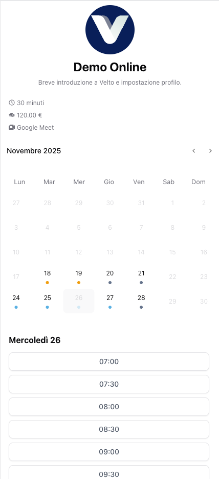 Siamo una startup e utilizziamo Velto nel nostro processo di sales, la piattaforma è intuitiva, la funzione di reminder su WhatsApp è una svolta, molto più immediata rispetto a email o SMS e perfetta per ridurre i no-show. Il team di supporto è sempre sul pezzo: rapido, disponibile e attento a qualsiasi esigenza.